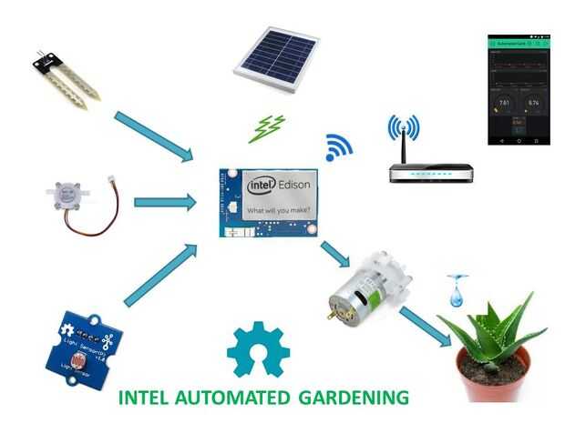 El corazón del proyecto es Intel Edison. Está conectado a los sensores diversos (como humedad, luz, temperatura del suelo, agua etc.) y un Pump.The de agua los sensores monitorizan los diferentes parámetros como el flujo de humedad del suelo, la luz del sol y el agua / consumo entonces se alimenta a la placa de Intel. Entonces la board Intel los datos procedentes de los sensores del proceso y da el comando a la bomba de agua para regar la planta.