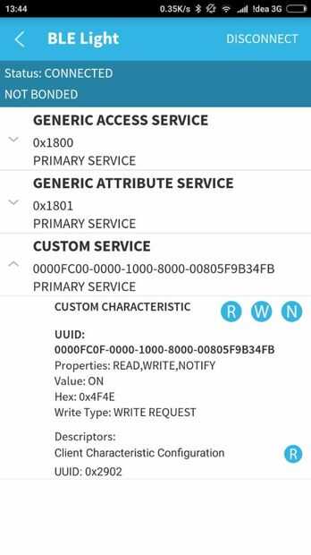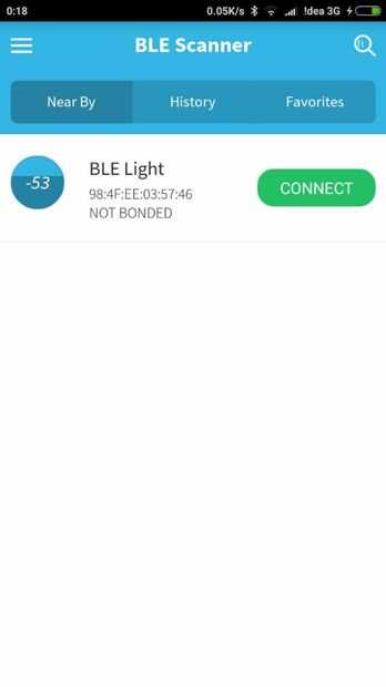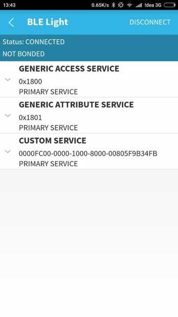 Descargar el Explorador BLE u otro equivalente app para tu smartphone. Conéctese a "BLE luz" y utilizar el "servicio personalizado". Ahora puede leer, escribir y suscribirte a las notificaciones de su periférico. Para encender la luz, envíe la cadena "1" y "0" para apagar.