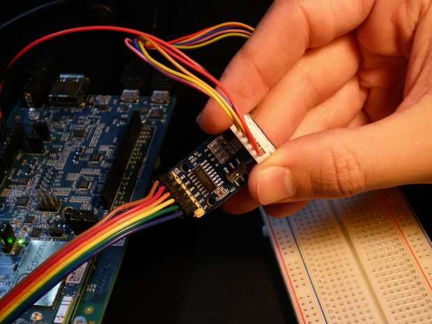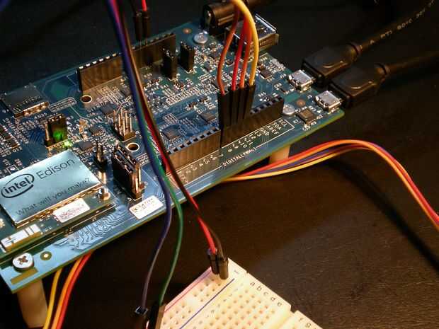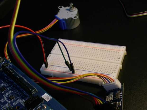 A continuación, conecte los cuatro pines de entrada--IN1, IN2, IN3 y IN4 - en los pernos de salida 8, 9, 10 y 11 (respectivamente) en el Edison. El código de ejemplo utiliza estos cuatro clavijas, aunque supongo que se pueden utilizar cualquier pins quieres! Sólo asegúrese de que están enchufados en el orden correcto (es decir, no conecte 1 pin 9 en el Edison, o el motor no gira).