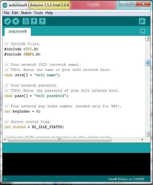 Introduzca el SSID y la contraseña de tu conexión Wifi en el código. Luego cargar el código en el Edison. Asegúrese de conectar el cable Micro USB al puerto más cercano a la entrada de energía.