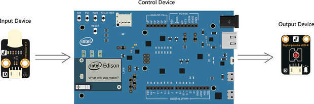 Hay tres partes del dispositivo, parte entrada, control de parte y parte de salida. Sensor de movimiento PIR es la parte de entrada. Edison es la parte de control. LED es la parte de salida Sensor de movimiento PIR es un sensor digital y LED es un dispositivo digital.