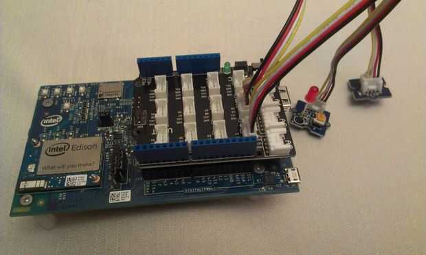 El Edison de Intel con la placa Arduino de arranque se utiliza para el dispositivo de IoT. El Edison tiene coche LEDs, tiene puertos GPIO digitales para conmutadores y un puerto analógico que puede manejar un altavoz. Para el prototipo y la hackathon, se utilizó una luz roja LED y un interruptor del kit del arrancador del Grove. El kit Grove viene con muchos sensores esenciales para cualquier proyecto.