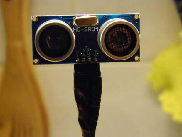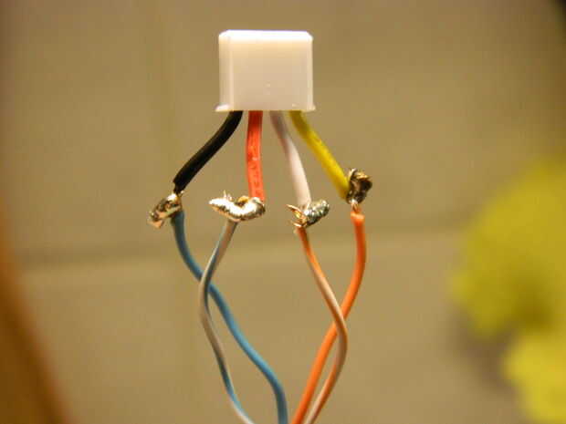 Luego soldar el conector de escudo en el otro extremo del cable. Se utiliza este conector para el sensor de ultrasonido HC-SR04. Tenga en cuenta el orden de cable ya que necesita Vcc + 5 (rojo a azul/blanco) y GND (negro a azul) y el gatillo (blanco a naranja/blanco) y Eco (amarillo a naranja).