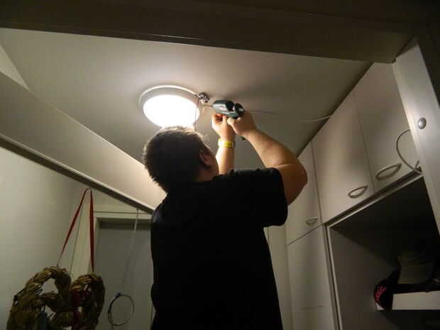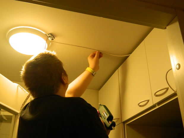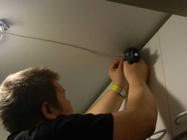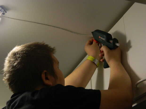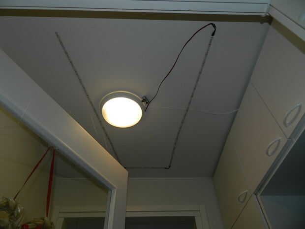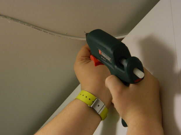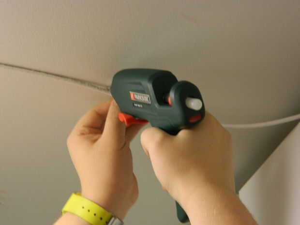 Después de soldar los cables listos me llevó una pistola de pegamento y había pegado al techo. Usar ganchos de cable pero estaba fuera de ellos. El pegamento funciona bien y no deja ninguna marca en él cuando quita, bruja es importante ya que estoy viviendo en una casa alquilada.