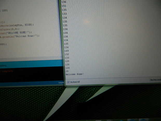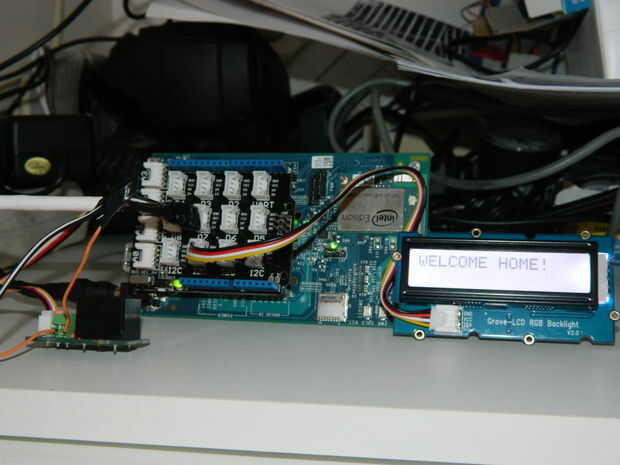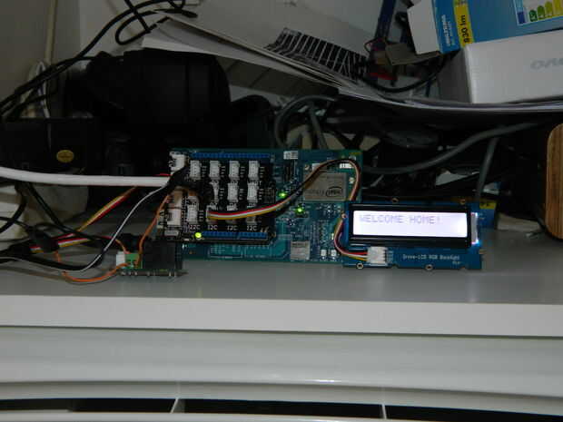 Codificación final se hace cuando todo el sistema está en su lugar. Esto es difícil si la habitación es pequeña y llena de abrigos y zapatos como si me hubiera. El sensor de ultrasonido da una lectura "defectuosa" que el suelo está más cercano de lo que realmente es. El techo es de unos 3 metros de altura y el sensor muestra que la altura es de 179 cm. Esto es causado por todas las capas y los zapatos en la habitación. Pero puedo vivir con eso. El código fue fijado en 100 cm, bruja significa que si no hay objeto más cerca de lo 100 cm el relé conmutará en modo conductivo y la luz se quema. Esta configuración funciona bien en mi caso. Cada vez cuando la luz quema el Edison de Intel le dará la bienvenida Inicio. Todo el tablero se esconde en el armario excepto la bruja de la pantalla de LCD es legible en la entrada.