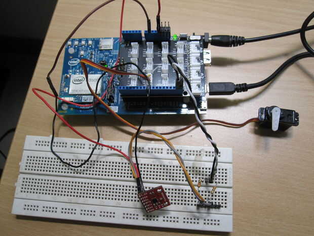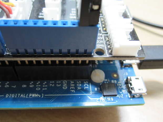 -El motor servo consume mucha corriente, así el cable USB no suministrar suficiente energía para hacerlo correr. Por lo tanto, se necesita batería de 9V o un adaptador para alimentar más a través de J1 DC Jack.