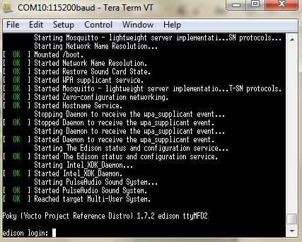 A continuación, abra el software del término fav, vamos a utilizar el término de Tera (https://ttssh2.osdn.jp/index.html.en) y establecer el puerto COM correcto para Edison y velocidad en baudios a 115200. Y eso es todo, ahora habla con su tablero de Edison.