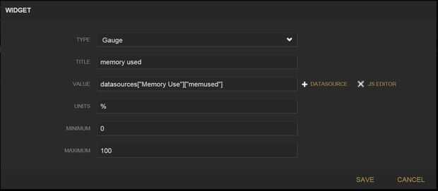 A continuación añada un elemento de visualización y ese origen de datos. Haga clic en "añadir panel" y luego el signo más en el panel recién agregado para añadir un elemento. Aquí estoy configurando un indicador para mostrar la memoria libre (Nota: utilizar el "+ datasource" botón para rellenar automáticamente en esa sección con los datos que te interesa):