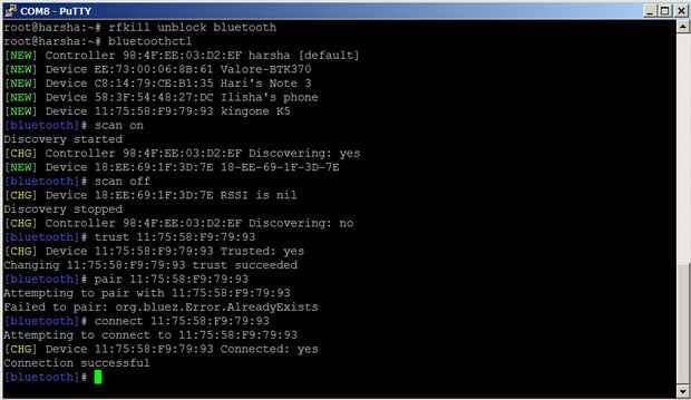 Para conectar a los altavoces Bluetooth, enciéndalos y asegurarse de que están visible. Escriba los siguientes comandos en masilla: