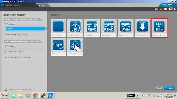 Iniciar un nuevo proyecto de Intel XDK. Usar una plantilla de "Internet de cosas Embedded Application". No de la sección de "HTML5 compañero híbrido móvil o aplicación Web". Recomiendo usar sólo la plantilla para "OnBoard LED parpadear".