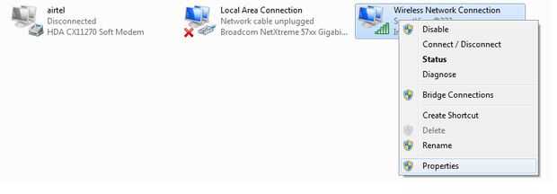 Haga clic derecho en tu conexión de red inalámbrica y haga clic en 'Propiedades'