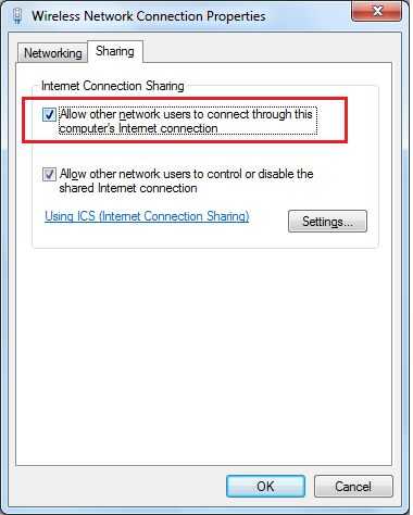 Ir a la pestaña 'Compartir' y marque la opción 'Permitir a usuarios de otras redes conectarse a través de conexión a internet de este equipo'