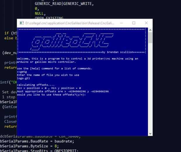 aplicación de Windows está escrita en c y el software está escrito en una mezcla de arduino y c. puede conseguir el código en mi GitHub galileo-cnc . También le aconsejo que eche un vistazo al informe del proyecto para más detalles. Espero he educado al menos algunos de ustedes y esperanza tan ven a alguien repetir esto y espero hacerlo mejor.