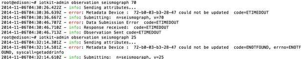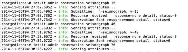 Cuando el sensor se haya registrado a un componente apropiado, puede transmitir datos de observación a la página de IoT Analytics. Para verificar que el sensor ha sido registrado correctamente, ejecute el comando de observación para enviar elementos de datos individuales en el sitio de análisis de IoT. Por ejemplo, he probado mi seismometer entrando en ambiente terminal de mi Edison y escribiendo