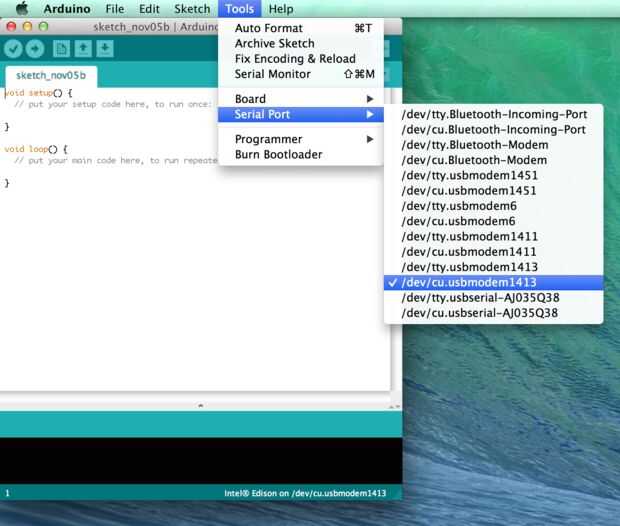 Nota: El sketch de Arduino no subirá si utiliza cualquier puerto además de /cu.usbmodem. Cualquier puerto /tty no funcionará, y cualquier puerto /cu.serial no funcionará bien.