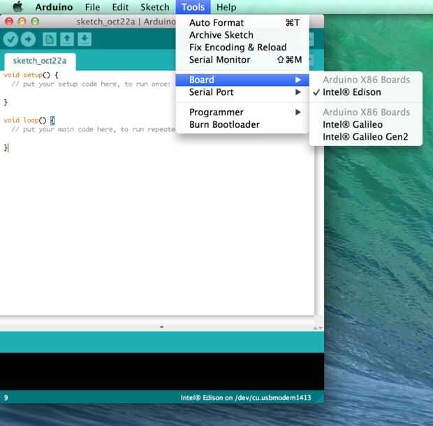 - En "Herramientas" -> "Tablero" seleccione "Intel Edison"