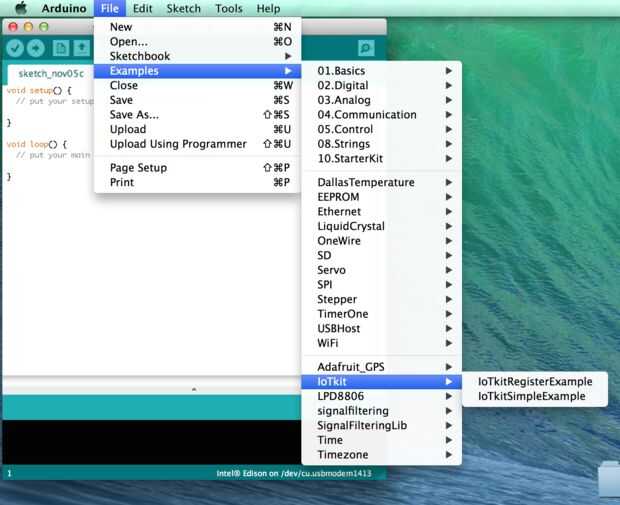 - Reinicie el IDE de Edison para invocar el cambio. Verá IoTKit en archivo -> ejemplos.
