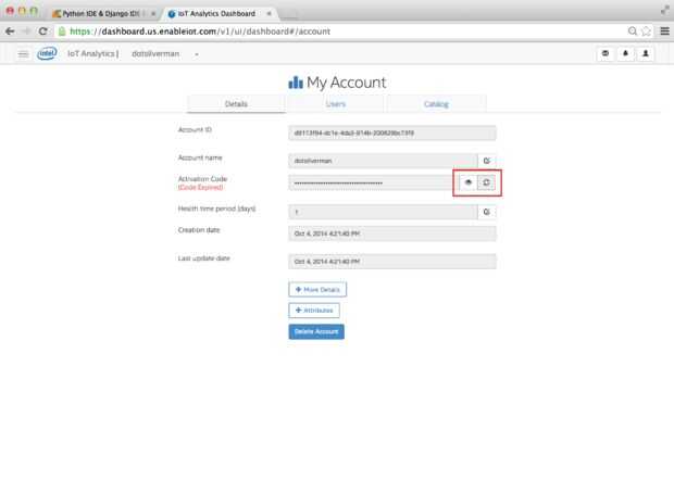 Pegue el código de activación donde * código de activación * está escrito. El proceso de activación se crea un registro de dispositivo en la nube, asocia el dispositivo a su cuenta (el código de activación procedencia) y proporciona las credenciales de seguridad. El dispositivo ya debe estar activa todo el sistema. Puede verificar esto en tu tablero de IoT en el cuadro de "Dispositivos".