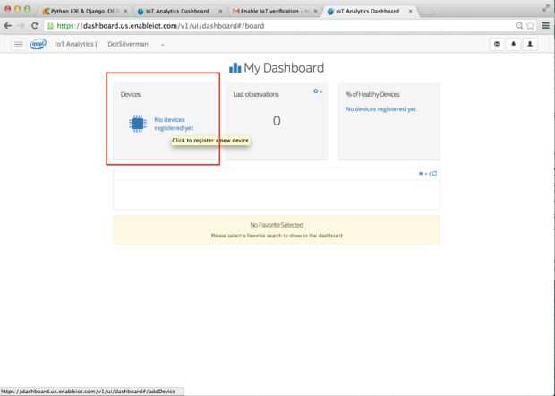 En este punto que usted sabe su Edison puede conectarse a la nube, pero todavía necesita ser colocado en el tablero de instrumentos de análisis de Intel. Registrar el dispositivo, abre un canal de comunicación entre él y su cuenta de nube. Los pasos siguientes implican mucho de ir y hacia atrás entre la línea de comandos de Edison y el dashboard IoT Analytics. Para hacer las instrucciones más claras, yo estoy etiquetado cada paso como 'CL' (línea de comandos) o 'AD' (Analytics Dashboard).