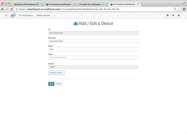 2. (AD) vaya a la página de Dashboard Analytics en línea. Haga clic en el cuadro gris de "Dispositivos" para registrar un nuevo dispositivo. Pegar el ID del dispositivo en los cuadros de texto "ID" y "Gateway". El dispositivo nombre y etiquetas son opcionales. Haga clic en "Guardar" para agregar el dispositivo. Navegar de nuevo a la pantalla de inicio y haga clic en el cuadro de "Dispositivos" otra vez para ir a la página de Mis dispositivos . Se mostrará su nuevo dispositivo. Después del registro, los dispositivos permanecen en el estado "creado". A continuación, el dispositivo debe activarse desde el propio dispositivo.