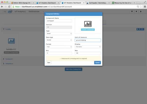 Por ejemplo, construí un sismómetro que está conectado a un pin de entrada analógico en mi tablero de Edison. Para recopilar datos de mi seismometer, he creado un componente llamado "sismógrafo". (Sismómetros y sismógrafos son términos algo intercambiables. Son dos dispositivos que detectan temblores de tierra durante un terremoto).