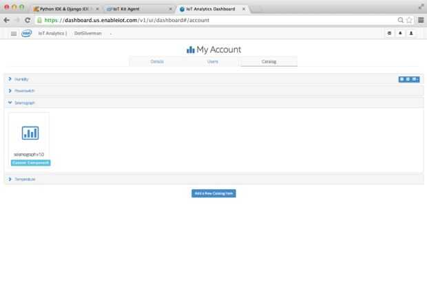Dispositivos de IoT de Intel como el tablero de Edison tienen digitales y analógicos pines GPIO que pueden conectarse a una variedad de sensores. Una vez que el dispositivo está registrado, datos de los sensores del dispositivo se envían al tablero, IoT. Sin embargo, para obtener datos de un sensor primero debe crear un elemento de catálogo para él. El tablero de mandos de IoT llama artículos del catálogo "componentes", y hay un componente para cada sensor conectado a su dispositivo de IoT. Esto permite que su tablero de instrumentos tomar datos en tiempo real desde su dispositivo.