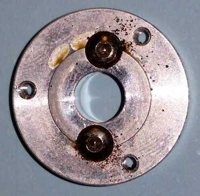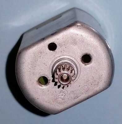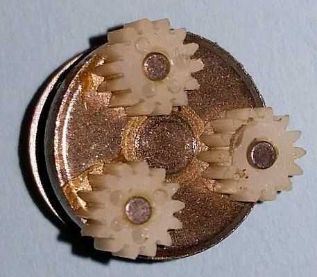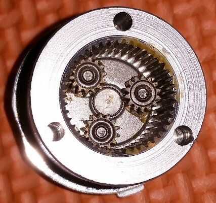 Solo para quienes gustan de un mejor aspecto a las piezas, aquí el motor de la vivienda con la rueda del engranaje hacia usted y mostrando los dos agujeros roscados para el anillo de montaje. Luego viene la primera etapa de cambios, con una arandela y una rueda del engranaje metálica hacia abajo/a. Este engranaje de la rueda se activa los 3 engranajes acero, de la segunda etapa, que puede verse en la vivienda. El eje de salida en forma de D apuntando lejos, es parte de la placa/disco llevando las ruedas del engranaje de la segunda etapa. Finalmente es el anillo de montaje que las interfaces motor y engranaje de la caja - sucedió así, por lo que rompió las fotos antes que limpiar!