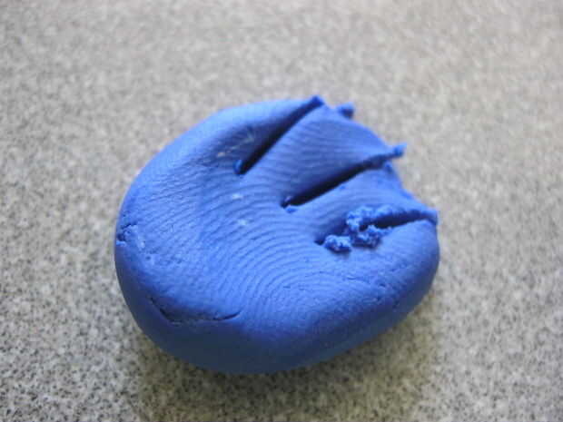 Step3-(Hands) - tomar más de sus arcilla azul rollo dos bolitas y aplanar hacia fuera. tener una herramienta de escultura y de la raja en un extremo del círculo tres veces y separarlos, esto es hacer que los dedos de los pitufos.