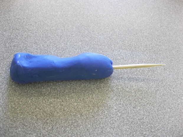Step2-(Arms) - tomar algunos arcilla más azul y rodarla en pieza larga alrededor de la longitud de un palillo de dientes. Lugar un diente escoge en cada uno de esto ayudará con el apoyo y fijación al torso.