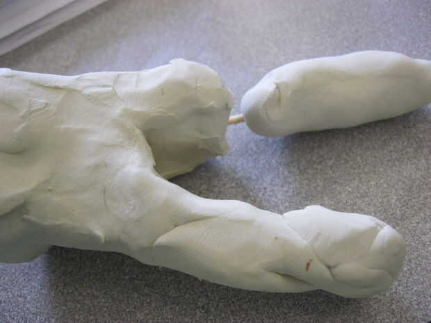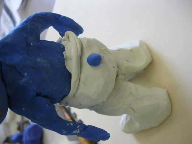 para la cola, tome un poco de arcilla azul rodar en una bola y palillo en.