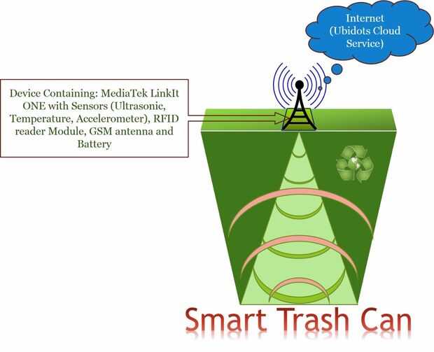 Básicamente, va a tirar las ondas de sonar para saber cuántas cosas dentro del contenedor. También mediremos la temperatura dentro del contenedor. Datos recogidos de los sensores son enviados sobre una red celular (GPRS) para el análisis y en plataforma web de Ubidots para los clientes. Una lista de envases para ser recolectados puede enviarse luego a los conductores para planificar una ruta eficiente. El proyecto también incluye monitoreo en tiempo real de los vehículos de basura del cuerpo cívico con RFID. El propietario del vehículo tiene flash su tarjeta RFID para que quién y cuándo y a qué hora basura bin se vaciaron. Le ayudará a frenar la pereza de recolectores de basura del municipio.