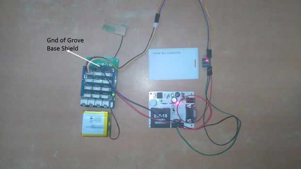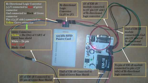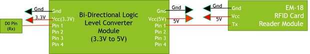 3. Conectar Tx de EM-18 al pin Rx (D0) de escudo base Grove via Bi — convertidor lógica direccional (5V a 3.3V).