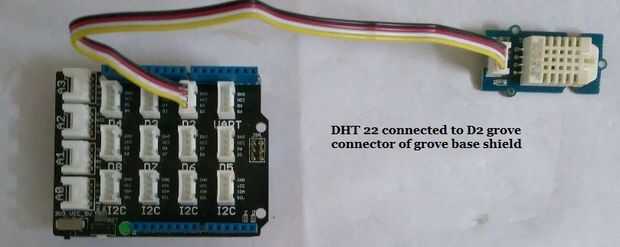 • Grove DHT 22 sensor está conectado al conector de grove D2 del escudo base grove es decir a voltaje (3.3V), tierra (GND), pernos de D2 de LinkIt. DHT 22 mide temperatura y humedad. El sensor de rango de DHT 22 detección es derecho del 5% - 99% RH y -40 ° C - 80 ° C. Y su exactitud alcanza satisfactoriamente hasta 2% RH y 0.5° C.