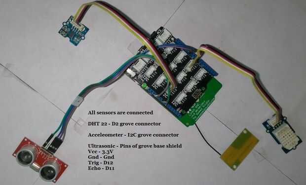 • Grove - sensor de 3 ejes Digital acelerómetro (±16g) está conectado con el conector I2C grove grove base escudo es decir voltaje (3.3V), tierra (GND), pines SCL y SDA de LinkIt.