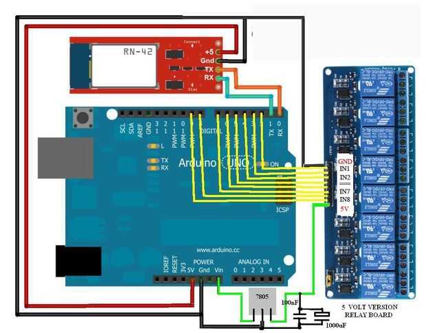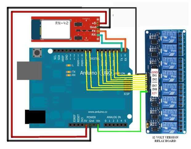 8 canales 12V o 5V módulo Arduino es recomпended utilizar un modelo de 12 voltios del escudo, aunque los 5 voltios se utilizan más. Si ha activado 8 equipos con alimentación de 5 voltios de regulador de voltaje de Arduino tiene riesgo para precalentar la regultor. Por esta razón utilizamos versión de 12 voltios y toma la alimentación directamente antes de regulador de construir-en voltaje en Arduino. Usted puede encontrar el escudo en Ebay.com