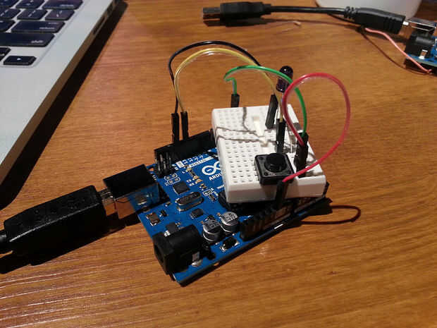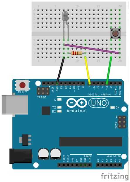 Construir el circuito como se muestra en el diagrama de Fritzing, con IR LED, una resistencia de 220 Ohm y un botón. Si tienes un segundo Arduino y protoboard puede dejar intacta la anterior configuración de receptor de IR y utilizarlo para probar este emisor de IR.