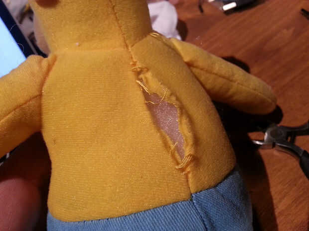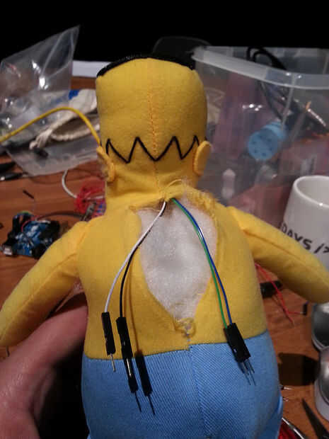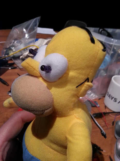 Perforar las patas del LED infrarrojo a través de los ojos de Homero. Tenga cuidado de no para romper las piernas. El títere utilizado aquí tenía una piel gruesa detrás de los ojos. Corte abierto detrás de Homer y usar el dedo para "tapar" un cable de puente F-M en las patas del LED. Es difícil recordar que la pierna es GND, pero usted puede probar fácilmente cambiando los cables en la placa. Repita la prueba en el último paso para asegurarse de que sus obras de cableado. Había conectado a uno de los LEDs y mantener el otro como una copia de seguridad.