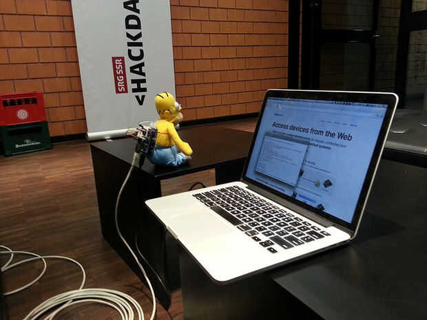Una vez acceso a las obras de vientre de Homero con el ejemplo Yaler, probar el código final, disponible en https://bitbucket.org/tamberg/srghack/src/tip/2014... (No olvide puerto su mando IR TV específicos y establecer su RELAY_DOMAIN.)