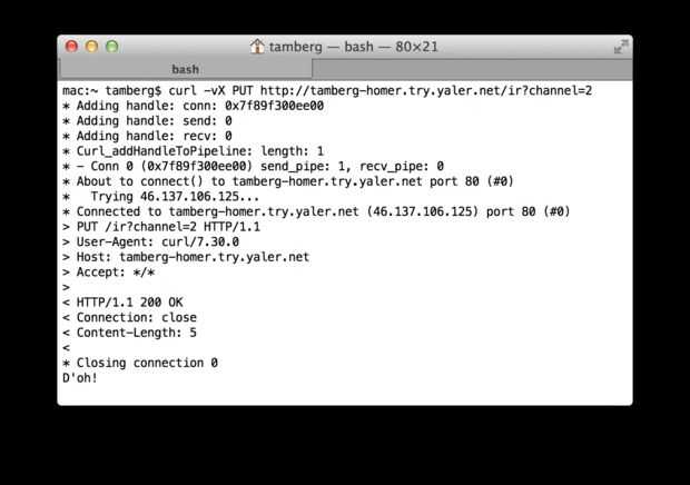 En su computadora, abra un terminal y ejecute Curl (http://curl.haxx.se/) con este comando: $ curl - vX ponerhttp://RELAY_DOMAIN.try.yaler.io/ir?key=2 (hacer seguro con dominio de retransmisión de su Arduino.)