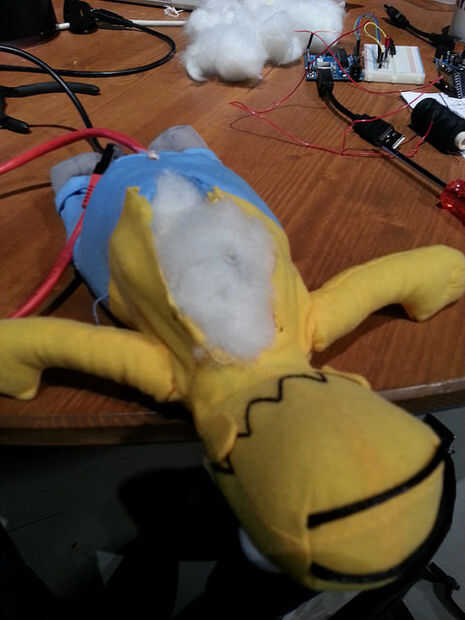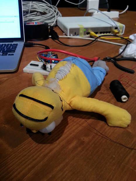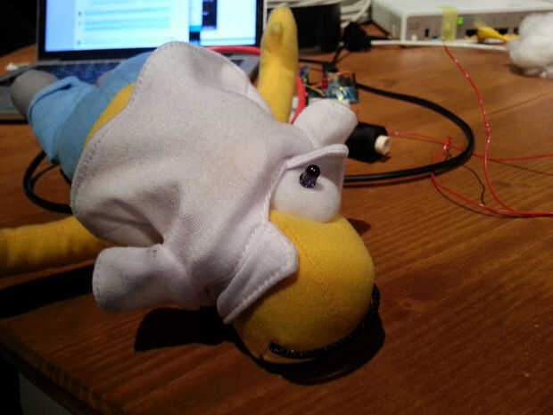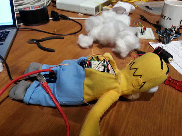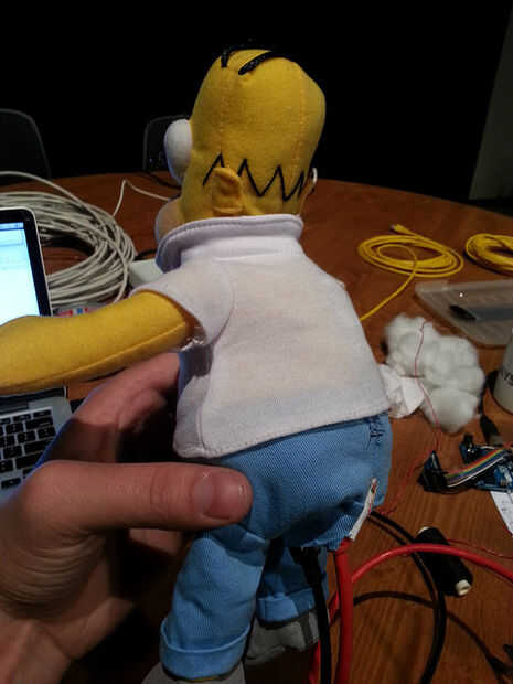 Ahora es el momento para integrar la electrónica en la barriga de Homer. Elimine el material de relleno e Inserte el Arduino, protoboard y Ethernet shield. No olvide conectar los ojos de Homero a la placa y asegurarse de que funcionan como se esperaba. Corte un agujero en el trasero de Homero por el cable USB y Ethernet. Luego cubrir la espalda con algún relleno y coser de Homero hacia atrás junto con unas puntadas. Tenga cuidado de no para romper los LEDs IR cuando se le viste para arriba otra vez.