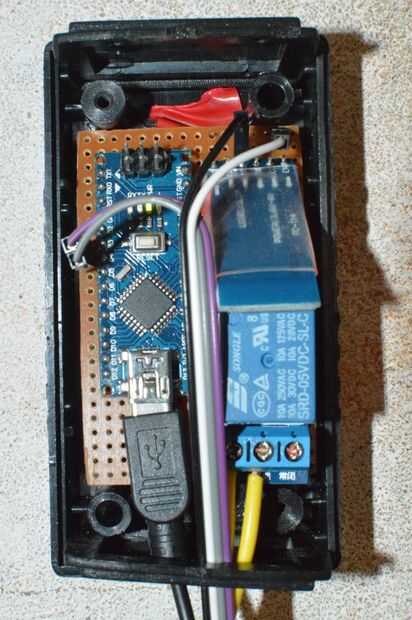 El último paso consiste en montar el recinto preferiblemente a unos pocos metros de la bomba. Recuerde que en la cinta la cabeza del tornillo que se usa para fijar la caja a las paredes. Conectar la D3, D4 (trigger, con VCC y tierra) para el sensor de ultrasonidos que es soldado en la placa se recomienda utilizar una mujer pines de los extremos soldados por lo que se puede quitar en cualquier momento para cualquier correcciones o actualizaciones. Se conectará el cable de cinta conectado al sensor ultrasónico con 4 pines macho que se conecta a los pines de las placas de circuitos. Finalmente Conecte la bomba cuando se está en apagado posición.