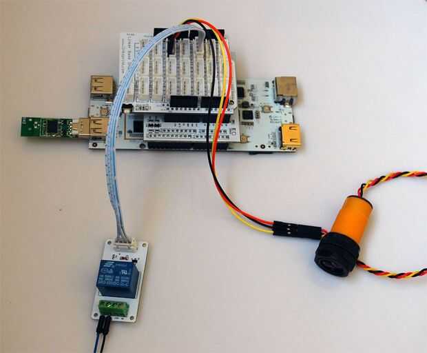 Para cerrar/abrir la puerta, nos encontramos con que la versión lifemaster utiliza una señal de control de 16V. Se alternará entre abrir y cerrar la puerta cuando dos líneas son cortas momentáneamente. Utilizamos tan aLinker módulo de relé para control. Conectamos el detector infrarrojo a D2 y módulo de relés de vinculador a D4 de pcDuino.