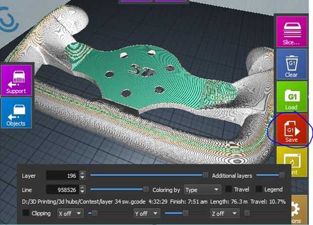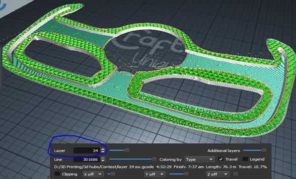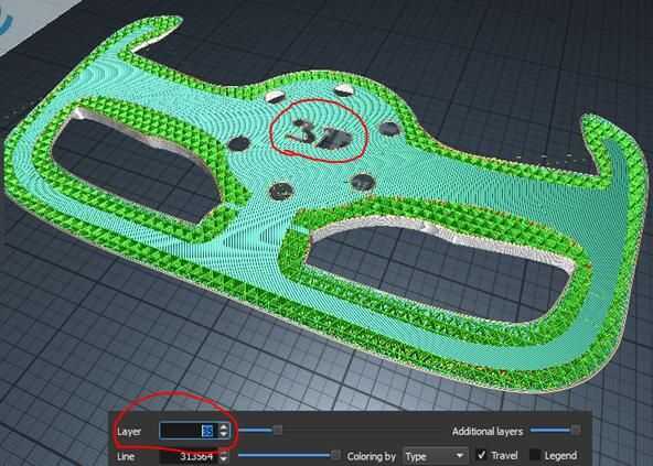 Parte 1 va de capa 0 a capa 34 y parte 2 va de capa 35 a capa 196. Imágenes adjuntadas le ayudará a visualizar cuando se detiene el proceso de impresión. Parte 2 comienza cuando la capa que contiene ' 3D "es impreso (capa 35).