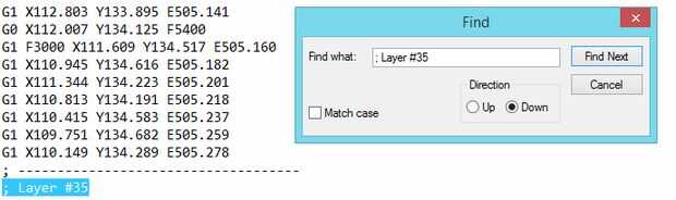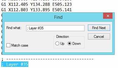 -Para la parte 2 G-code, reabrir el original código de g para eliminar la sección de la parte 1. Seleccione Capa #0 de la última línea de código de capa #34. Para llegar más rápido a la última línea. Ir a editar / buscar y escribe "; Capa #35 ". Esto le llevará