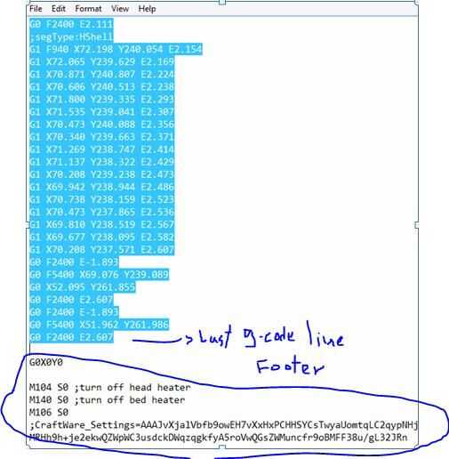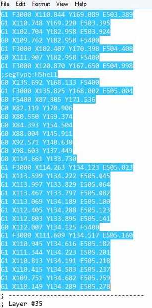 -A continuación, seleccione las líneas de "; Capa #35" a la última línea de código de g excepto la sección de pie de página que dice la impresora al inicio el estirador principal y enfriar todo. Para seleccionar las líneas más rápidamente, mantenga pulsado shift, desplácese hacia abajo y haga clic en derecha junto al último número de la línea final. Una vez hayas seleccionado parte 2 líneas de código, eliminar de golpe y guarde el archivo como: Part1.gcode