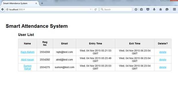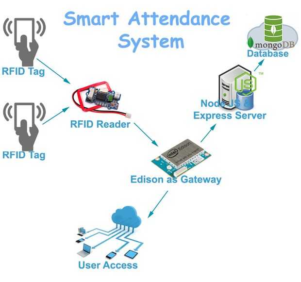Sistema de asistencia inteligente ha desarrollado basado en RFID y tablero de Edison de Intel para la aplicación de administración de asistencia para oficinas, escuelas e institutos. Este sistema es muy fácil de usar, estudiante o empleado llevará un RFID etiquetas tarjeta, vamos a instalar un sistema de asistencia basado en lector de RFID y Edison de Intel en las escuelas o institutos, el alumno tienen que mostrar su tarjeta RFID dispositivo, dispositivo de barrido único código RFID Tag, después de escanear la tarjeta de identificación no, el sistema buscará el alumno sobre la base de datos creado anteriormente. Si lo encuentra el estudiante en la base de datos al instante almacena fecha y hora de la entrada del estudiante. El sistema puede enviar correo electrónico a la dirección de correo electrónico de los padres después de la entrada del estudiante. El sistema puede ser accedido desde el navegador.