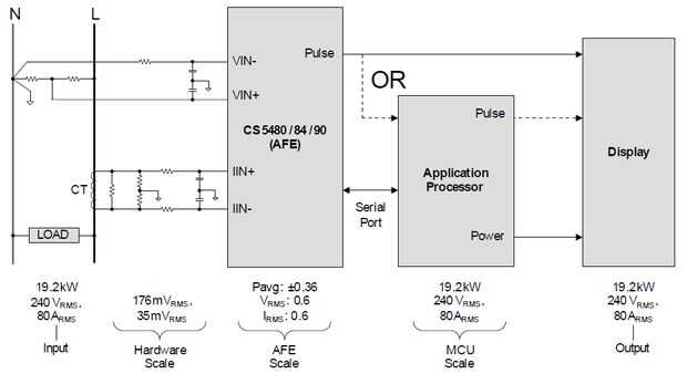 Escala de hardware: Las entradas de CS5490 se escalan usando circuitos de atenuación que se aplican la máxima amplitud de entrada de 176mVRMS o 35mVRMS, que es dependiente de un AFE obtener ajuste de 10 x ganancia or50 aumento de x, respectivamente.