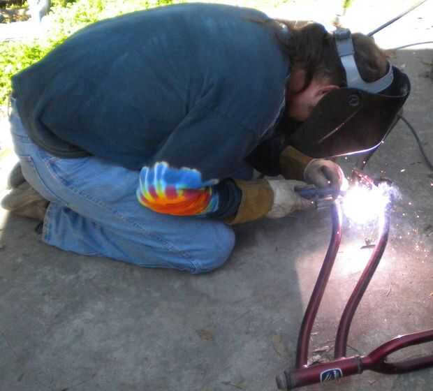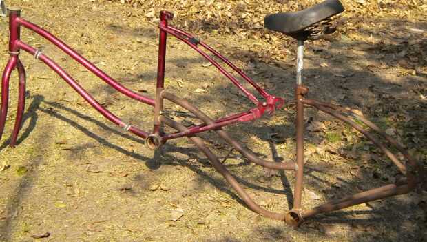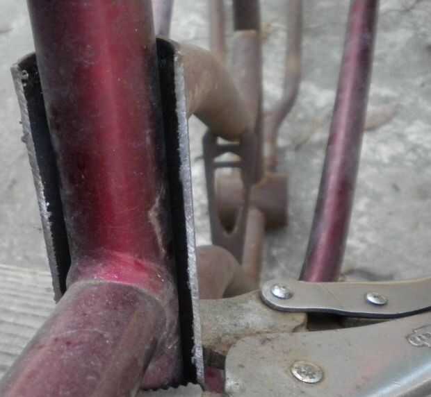 La mayor parte del triángulo trasero de Murray fue hacksawed fuera. El proyecto comenzó a tomar forma cuando los marcos se apoderó de vice y soldadas con autógena juntas. (Foto 3) Corte y soldadura se suavizan con una amoladora.