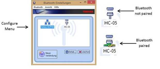Wenn el HC-05 es por primera vez conectada al PC, este se debe encontrar primero, reconocen casos y conectar al módulo de HC-05, esto se llama sincronización. Usando una PC de Toshiba, la imagen muestra la ventana de asistente de Bluetooth. Cuando se realiza la conexión, el símbolo de la HC-05 en la PC va a cambiar.