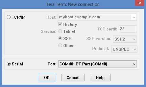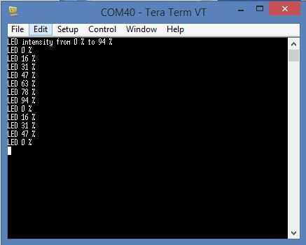 Asociación el HC-05 con el PC, un terminal virtual es necesaria para enviar y visualizar los comandos dado Arduino. El software selecte es término de Tera. Este programa permite seleccionar el puerto para la comunicación y visualizar los comandos sended y ver los comentarios recibidos. En este caso, el COM40 es attachet al HC-05. En la foto se aprecia, que wenn se da una instrucción, los comentarios son recibidos en la terminal virtual. En este caso, los comentarios indican el porcentaje de la intensidad de lo LED.